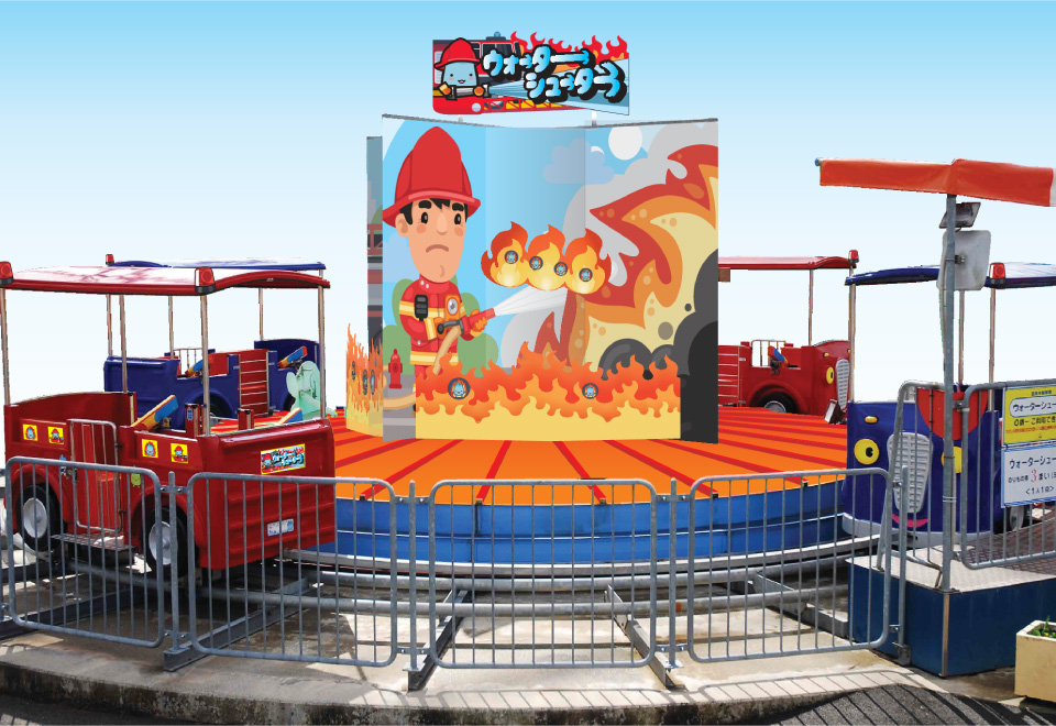 「ウォーターシューター」は、走りながら水鉄砲で標的をねらう、スリルいっぱいの乗り物! みんなも体験してみよう!