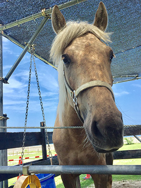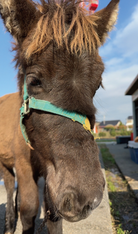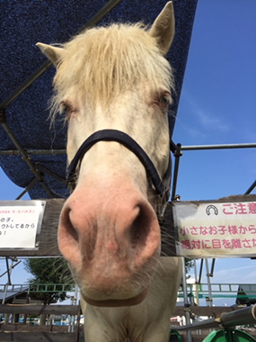 日本固有の馬・北海道和種の男の子。肌はピンク・色は珍しい佐目毛(さめげ)大きいけれどもとても甘えん坊です。ニックネームは『ハク』