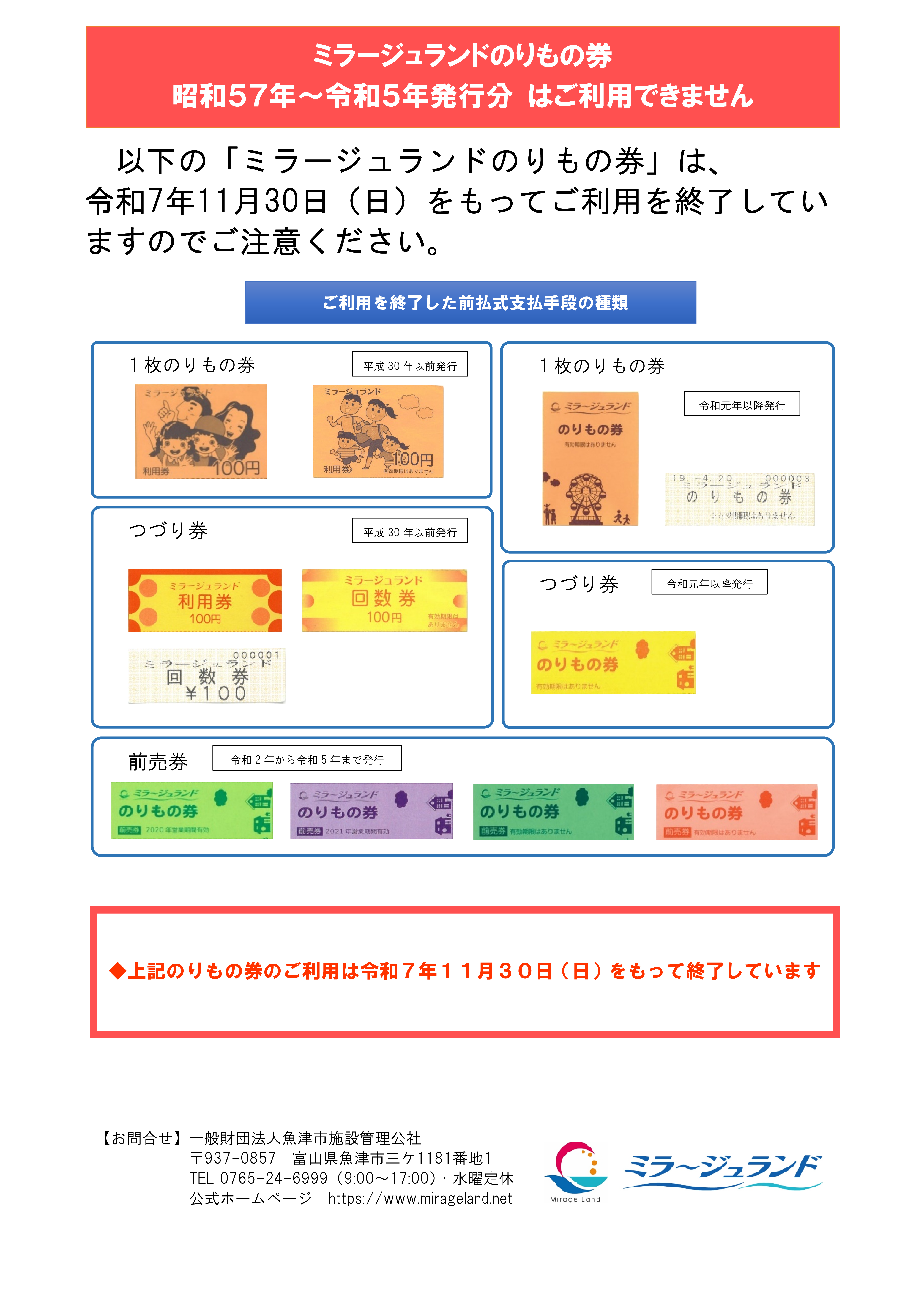 【重 要】「ミラージュランドのりもの券」昭和57年~令和5年発行分 ご利用終了のご案内